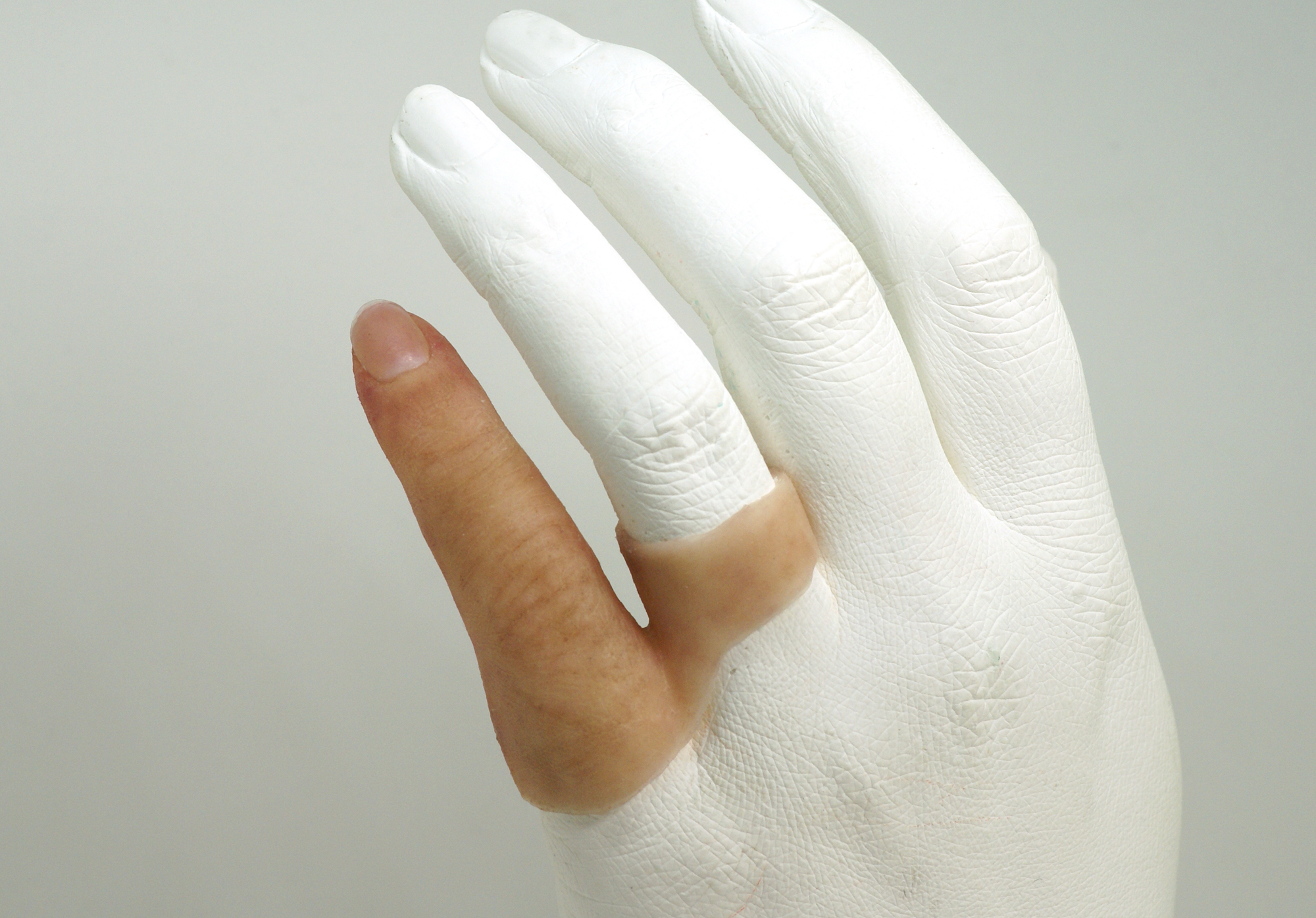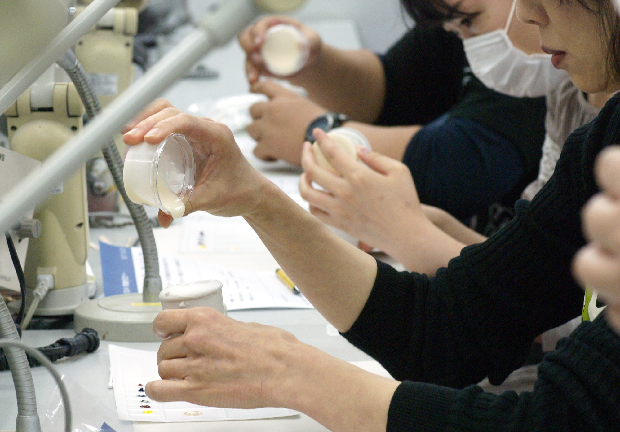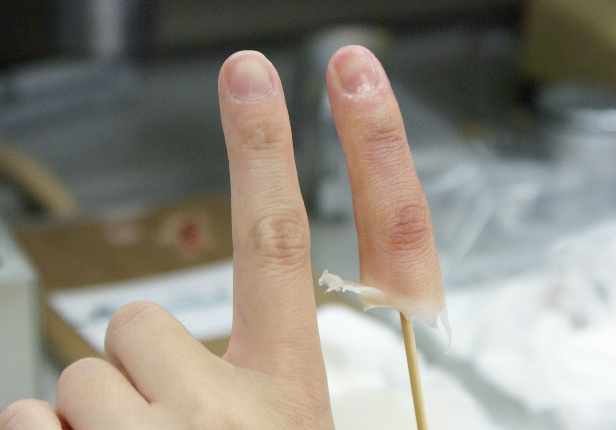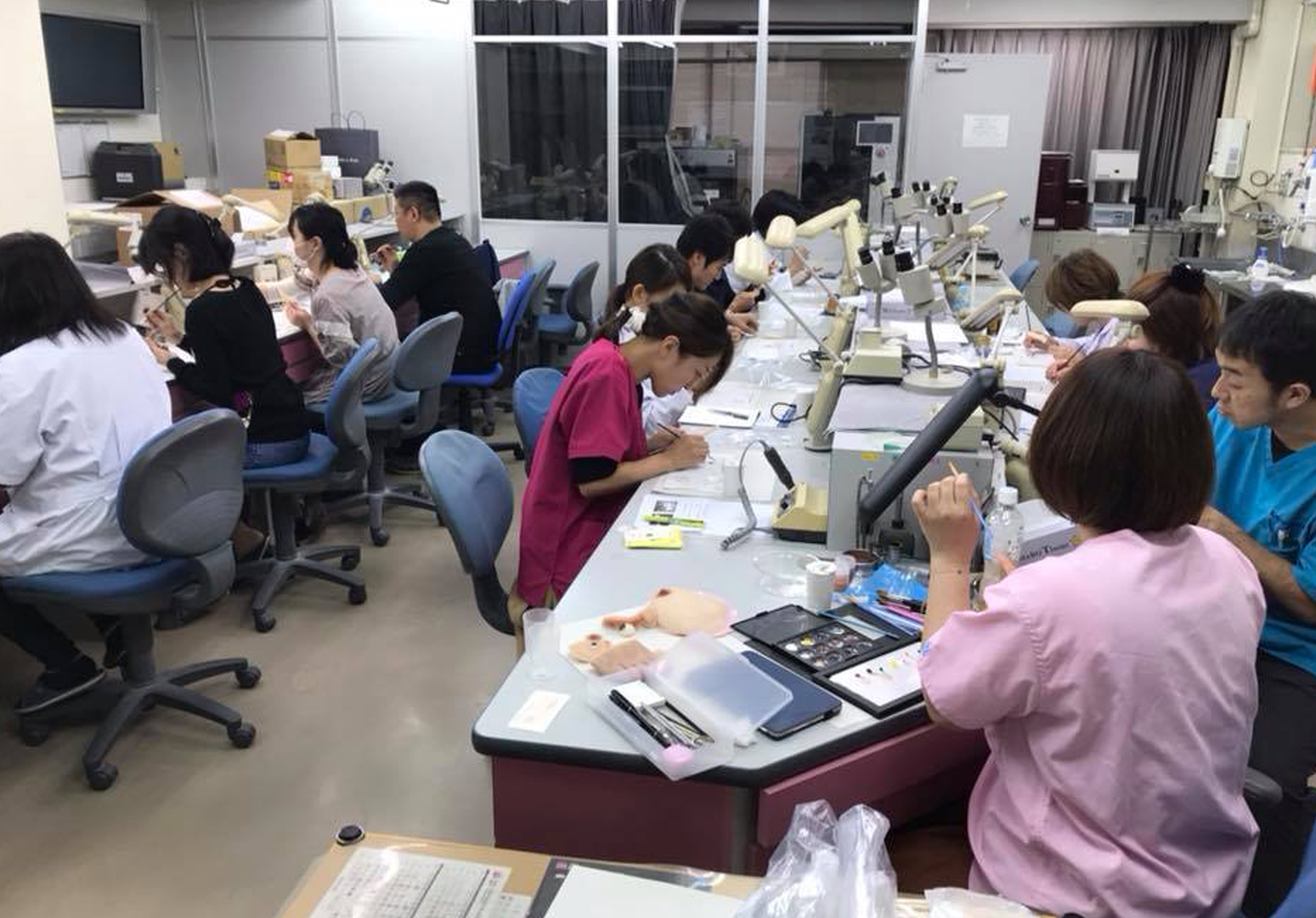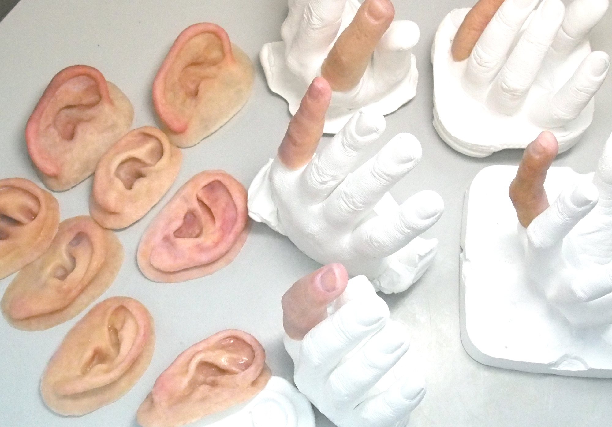 全12日の中で指や耳等の部位を実際に製作。受講者同士で印象採取し、ワックスアップ、埋没、シリコーン填入、外部着色、仕上げを行っていきます。
