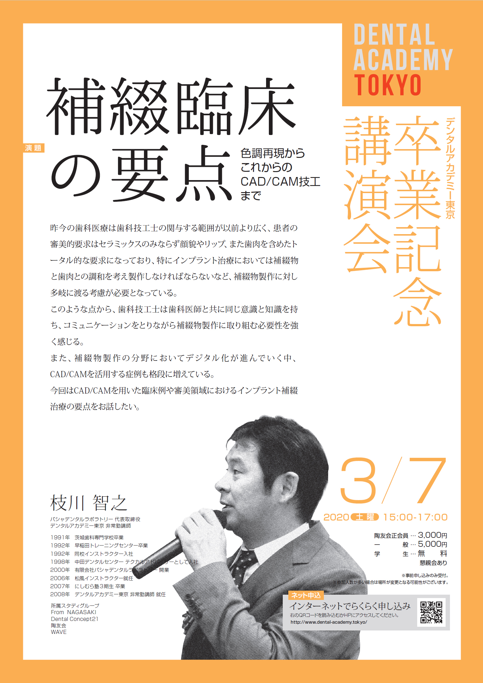 デンタルアカデミー東京非常勤講師、枝川先生による卒業記念講演会に一般の方もご参加いただけます。卒業生及び学生が優先となりますので、席に限りがございます。お早めにお申し込みください。