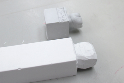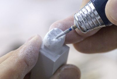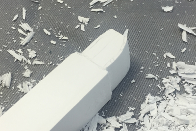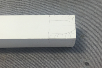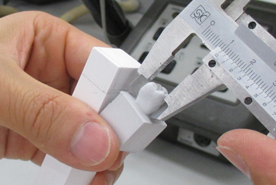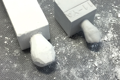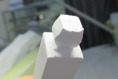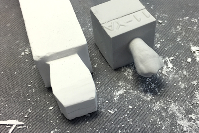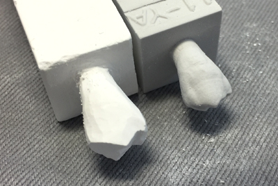 モデルのサイズをノギスで測り、石膏棒におおざっぱなラインを引き、彫る。