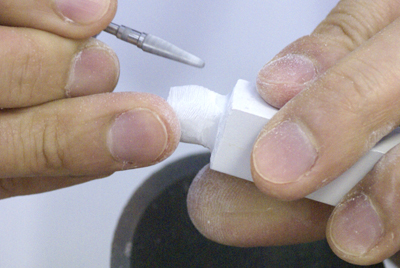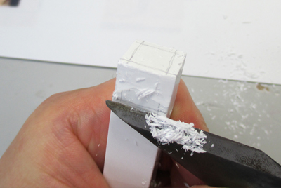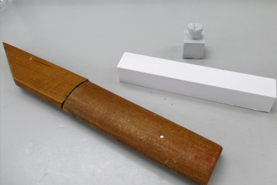 渡部氏より支給されたのがこの3点セット。サンプル模型と石膏棒、そして、どこか懐かしさを感じるナイフ…「初めてだからこのナイフで十分だよ!」と渡部氏。他のみんなが使っているようなシャープなデザインナイフが良かったけど、そこは我慢。